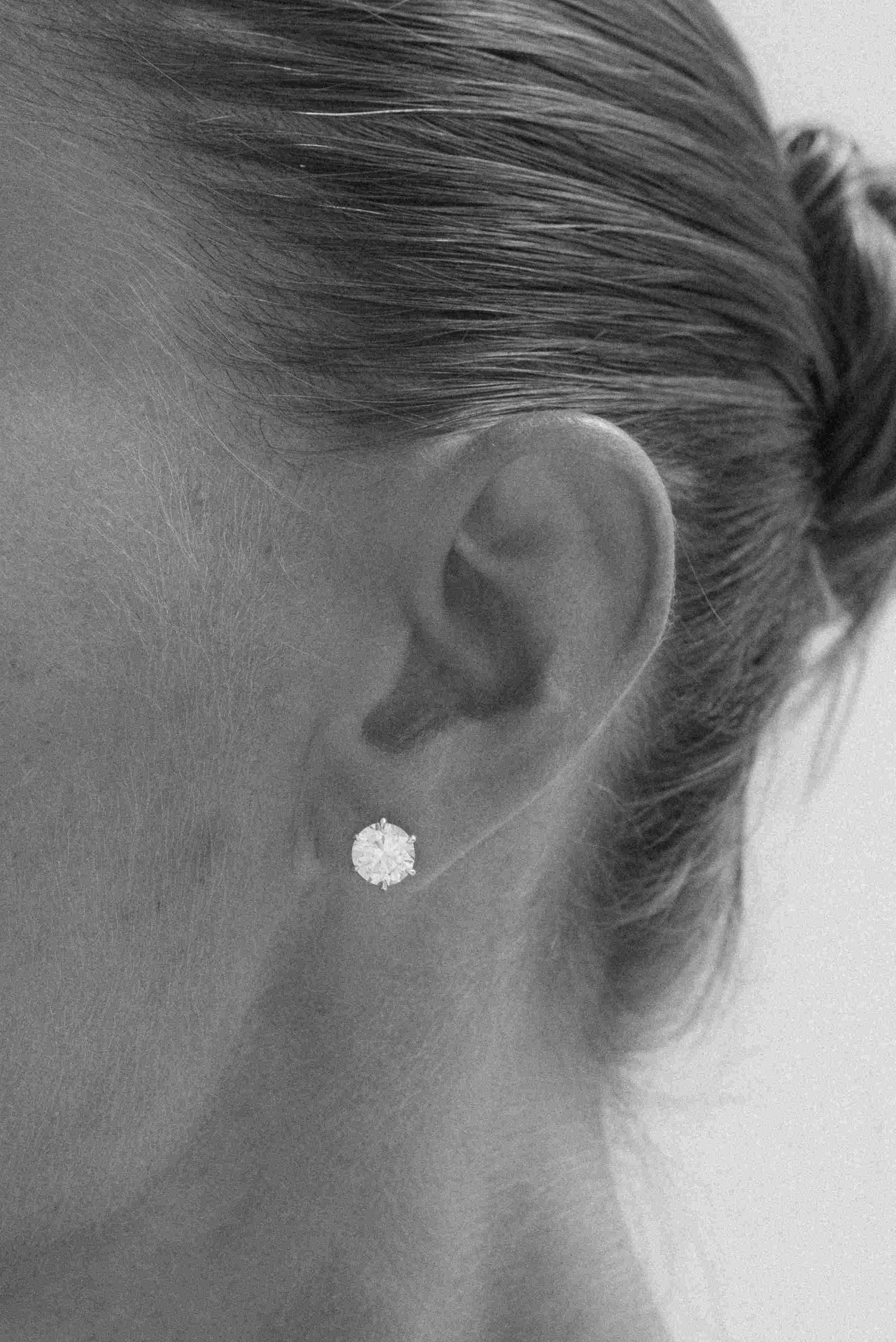 Model is wearing ear studs with 1.5 ct diamonds each.